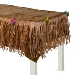 Faux Woven Luau Plastic Table Cover & Tan Raffia Grass Fringe Table Skirt With Flowers Set