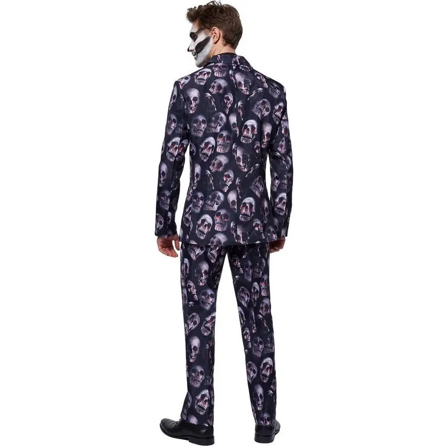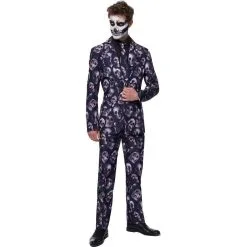 You’re the perfect mix of dashing and daring in this black suit with creepy bleeding skulls. This three-piece outfit for adults features a flattering, modern cut. The suit jacket has slim sleeves, narrow lapels, side vents, and a two-value design. This haunting Halloween suit jacket has a bright red lining and one internal pocket. Slim, flat-front pants have an elastic waistband and an extra two inches of material at the bottom hem for tailoring up to two sizes. The matching skeleton tie really makes the outfit!