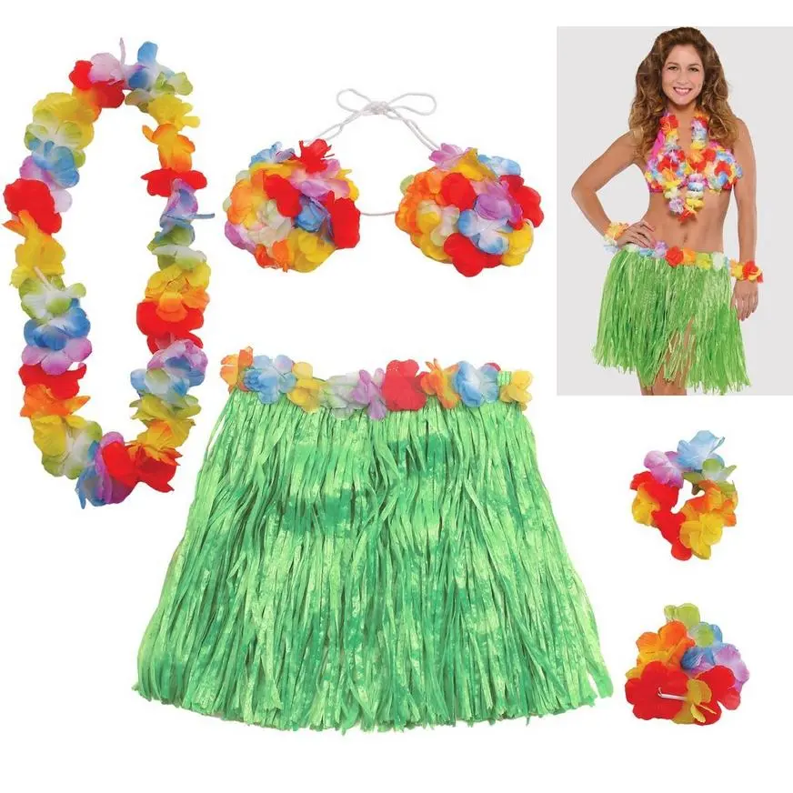 A tropical bonanza! This Faux Grass Skirt Kit has everything you need to make yourself over luau style. You’ll look island-ready in an essential plastic green grass skirt with colorful fabric hibiscus flowers attached to the elastic waist; a hook-and-loop closure securely fastens it. The adjustable string hibiscus bikini top is lined for comfort. Put on the finishing touches — a pair of stretch flower wristbands and a hibiscus lei — and it’s time to luau!