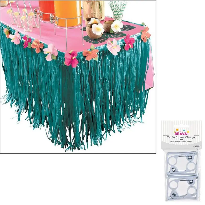 | 1 | Aloha Faux Grass Plastic Fringe Table Skirt with Fabric Flowers, 9ft x 30in (SKU 871472) |