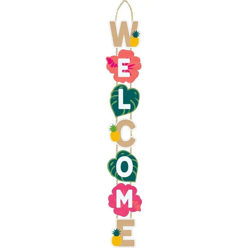 Invite guests into your home by decorating the entryway with a tropical-style welcome sign. The wooden “Welcome” headline hangs vertically with each letter accompanied by either a pineapple, hibiscus flower, or monstera leaf. Hang the sign by the attached rope loop to add a lively touch to your indoor or outdoor living space.