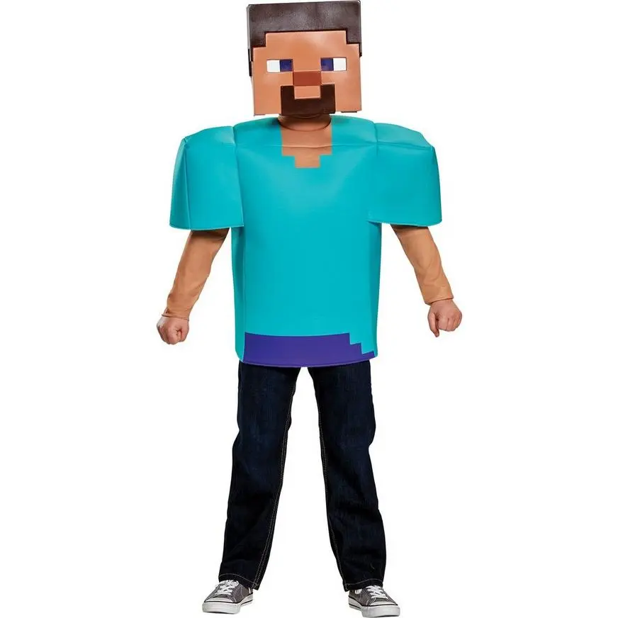 More on Minecraft Boys Steve Costume: Turn the Halloween party into a block party with a Steve Costume for boys. The block-shaped light blue tunic looks just like the shirt Steve wears in the Minecraft video game. To top off this Minecraft costume, put on the square pixelated mask that covers the entire face. Now that your little one is dressed up like Steve, he can grab his trusty sword and go explore Overland! He’ll love stuffing his inventory with candy when he trick-or-treats in a Minecraft costume for kids. Review the size chart for additional sizing information. Shoes and pants not included.