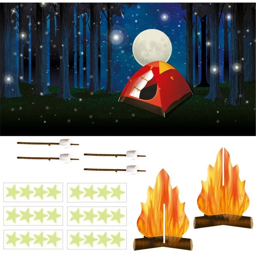 Set a starry forest scene in no time with this Camping Photo Booth Kit. The kit includes a plastic forest backdrop, a free-standing campfire cutout, marshmallow-on-a-stick props, and glow-in-the-dark star stickers.
