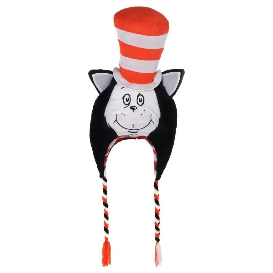 Rainy days will be full of joy when you wear a Dr. Seuss Cat in the Hat Peruvian Hat! This Cat in the Hat beanie features a design of the cat’s face with attached ears and a stuffed red and white top hat. Complete with black, red, and white braid attachments, a Dr. Seuss hat will keep you warm during the winter!