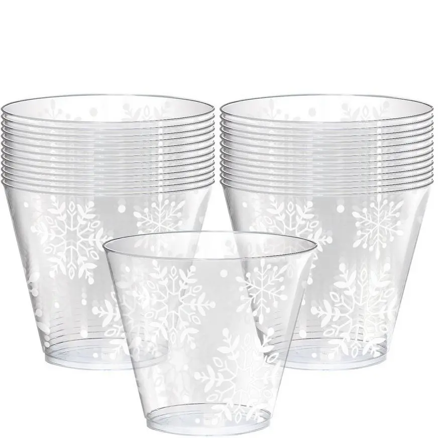 Nothing makes a holiday party cozy and fun like Dancing Snowflake tumblers filled with seasonal drinks! These clear plastic tumbler cups are printed with white snowflakes for that winter wonderland feeling.
