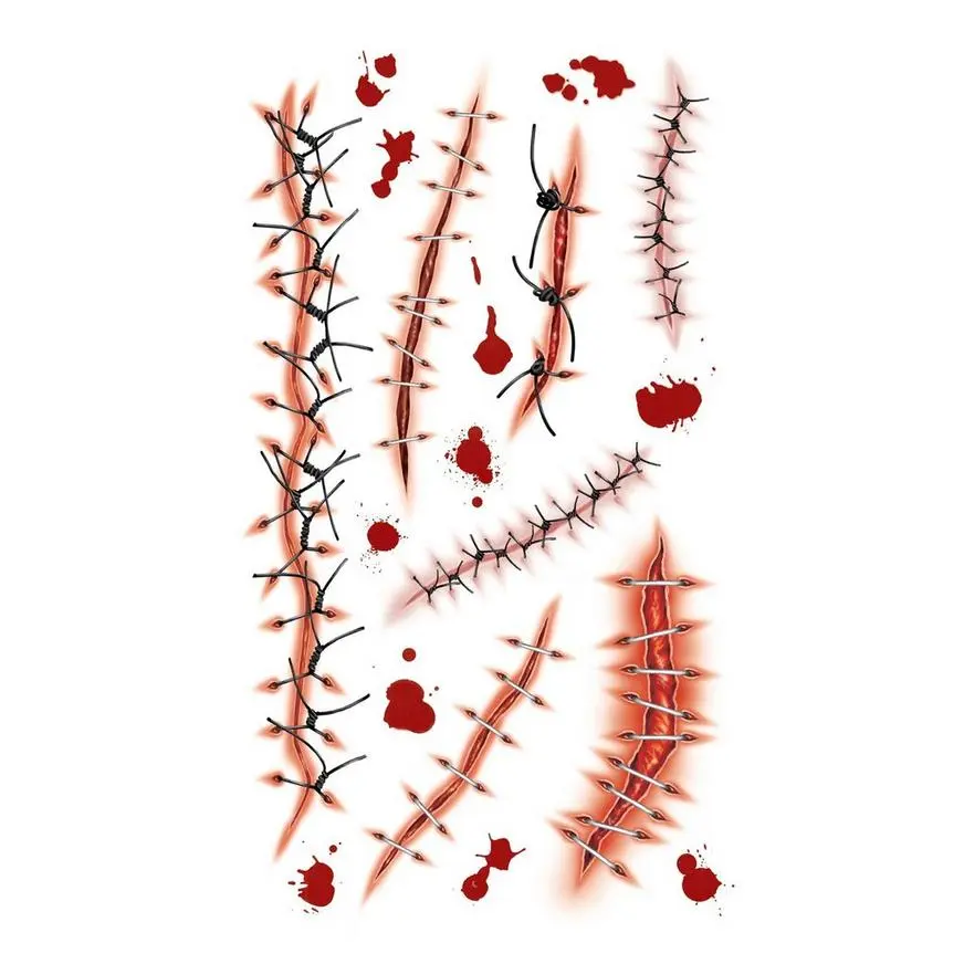 Put an authentic twist on your zombie costume with our Fake Stitches Tattoos! These temporary stitches tattoos create the illusion of patched-up wounds and gashes. Easy to apply and remove with soap and water, these Stitch Tattoos really bring your deadly look to life!