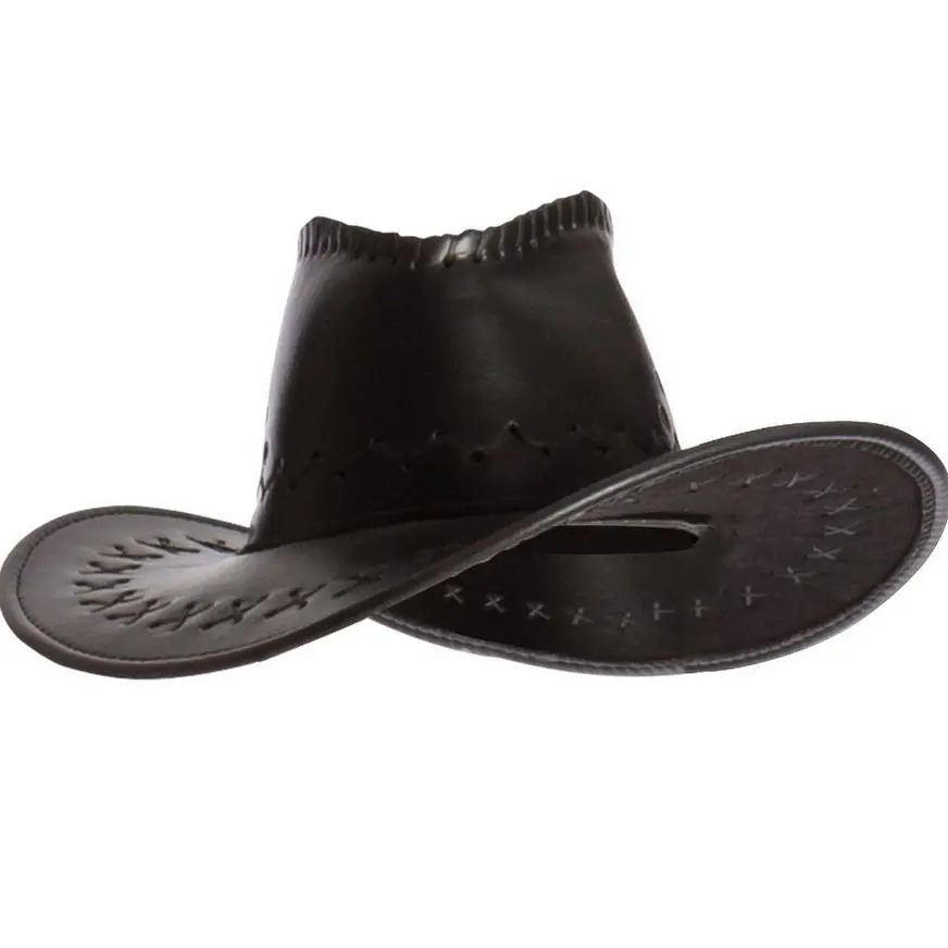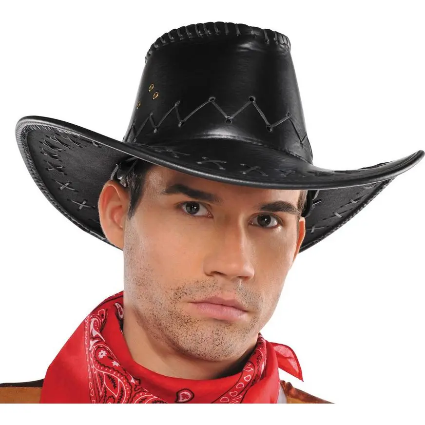 Head to the rodeo in style with a Faux Leather Cowboy Hat! This sleek cowboy hat features black faux leather material with detailed stitching. The drawstring chinstrap adjusts to fit most cowpokes. Great for the Wild West and the Australian Outback alike!