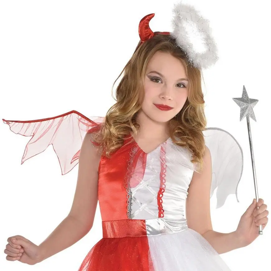More on Girls Naughty & Nice Costume: Your little one can be naughty and nice at the same time with a Devil & Angel Costume for girls! The costume includes a tutu dress that’s red on one half and white on the other. The costume also includes matching wings and a headband featuring an attached devil horn and halo. If your little one has good and mischievous sides, this costume is perfect for them! Review the size chart for additional sizing information. Shoes, leggings, and wand not included.