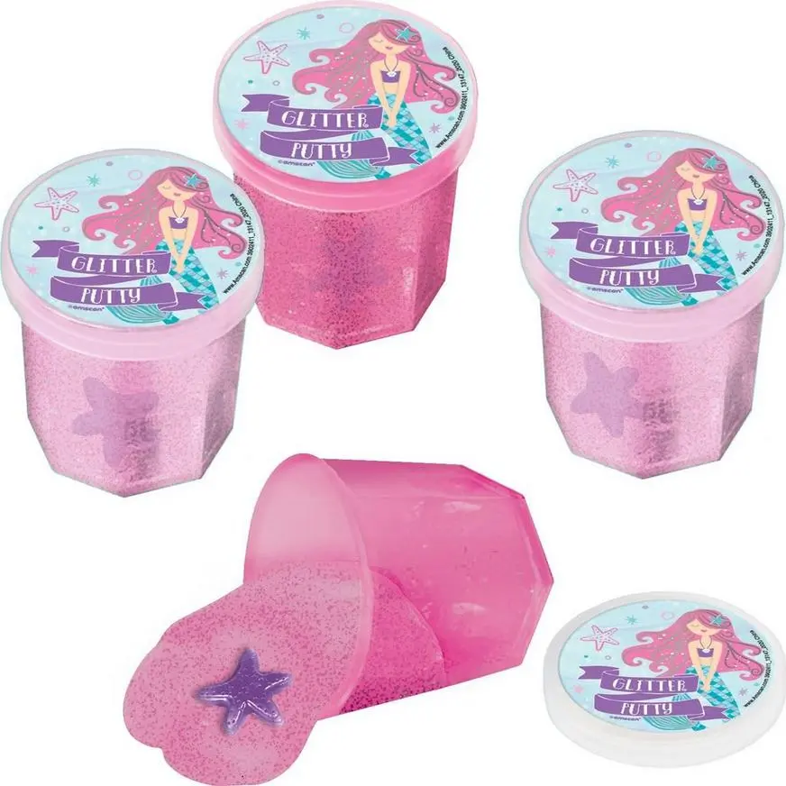 Send guests home with a magical reminder of your party with mermaid putty! The putty is glittery with a slime-like consistency and comes in a small plastic jar. Each bright pink or pink container also includes a special purple sea star prize! Add putty jars to favor bags or use them to fill a pinata.