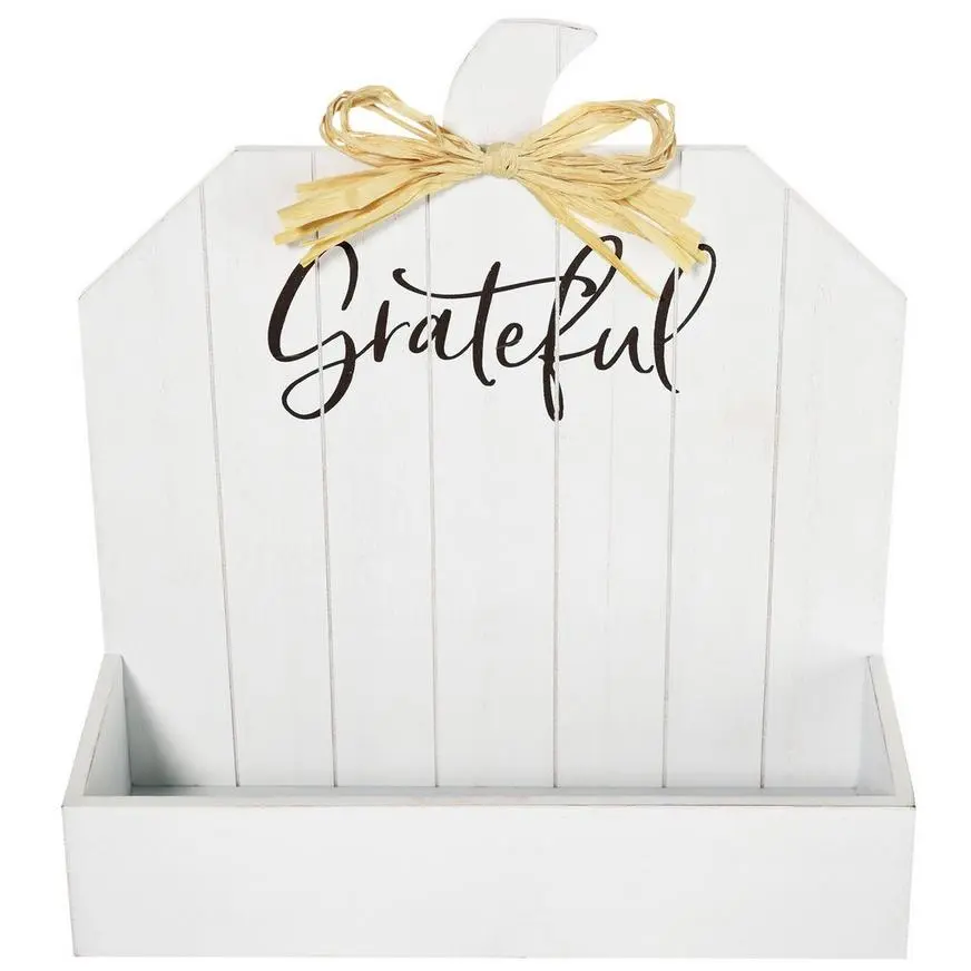 Create a custom Thanksgiving centerpiece with this pumpkin box. The rustic display features white fiberboard slats with a small display box in front and a raffia twine bow. Express your gratitude for the season with this unique “Grateful” countertop decoration.