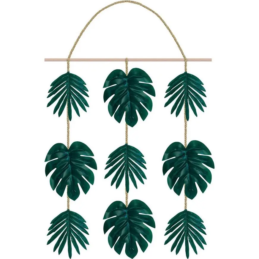 Add tropical beauty to your space with hanging palm leaves. This decoration features three strands of green leaves hanging from a wood bar. The plastic leaves are attached to natural twine, and the wood bar has a full half-circle of twine to hang the decoration. Use this elegant palm leaf decoration to set the scene at your tropical luau or jungle party.