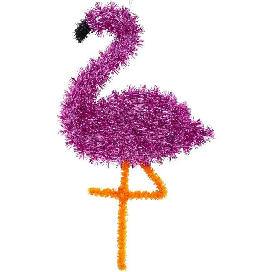 This fancy bird wants to hang out at your party! This Tinsel Flamingo Decoration has a sturdy plastic frame in the shape of a flamingo standing on one leg covered in pink, purple, and black tinsel. Hang this tinsel decoration by its silver string in a window or on your wall to create the perfect vibe for any summertime party!