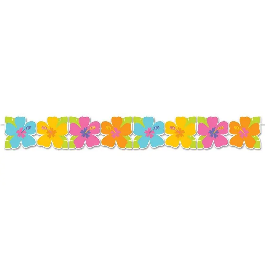 Aloha, party people! This Hibiscus Flower Garland creates a floral landscape perfect for your next luau or beach-themed party. Made from sturdy cardstock, this colorful party decoration features a string of hibiscus flowers in yellow, orange, pink, and blue. Attach our Hibiscus Flower Garland to the wall or window with double-sided tape or Sticky Tack (sold separately), so your guests are surrounded with lovely flowers all party long!