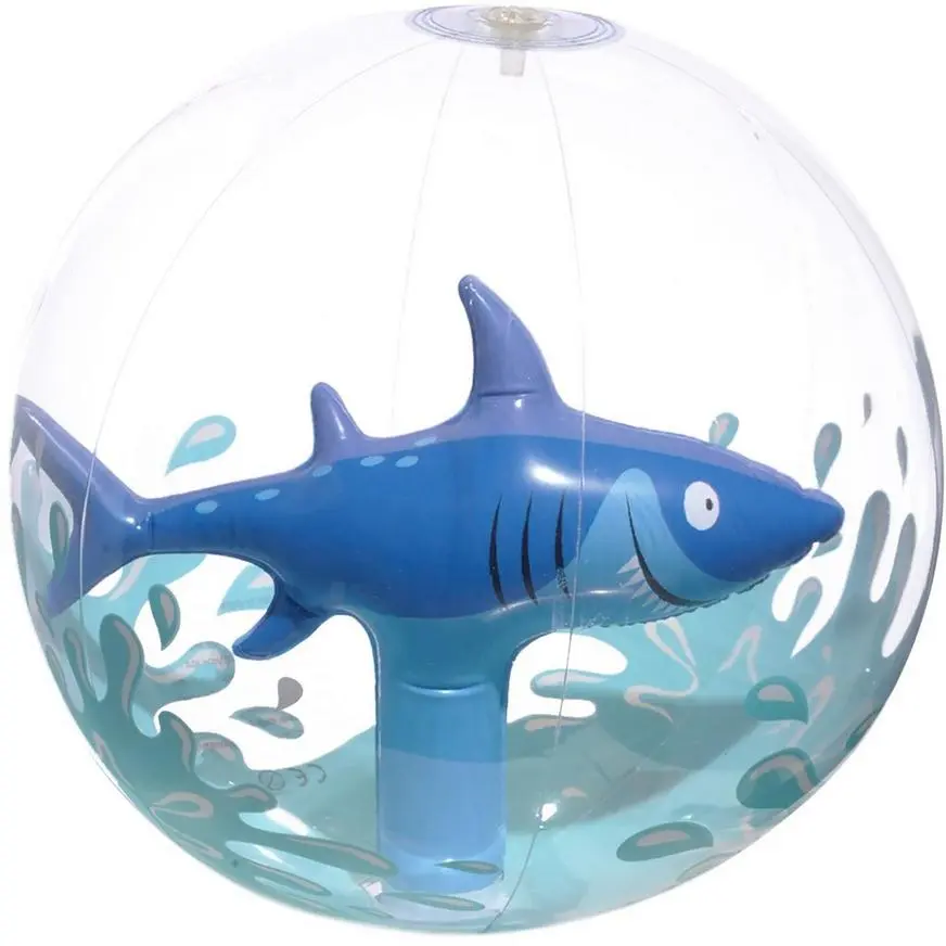 This clear plastic beach ball features a hungry-looking shark that appears inside the ball as you inflate it. Splashing water is printed on the ball below the shark, giving the toothy fish a dynamic look. Playing beach ball games with friends is never a bad way to spend a summer day. Who knew you could have fun playing with a shark at the beach!