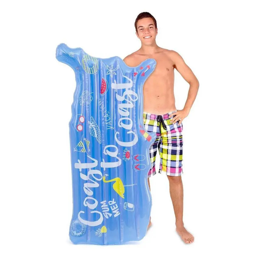 Have yourself a little pool R&R with an Inflatable Body Raft! This raft is shaped like a map of the USA and features the headline “Coast To Coast.”