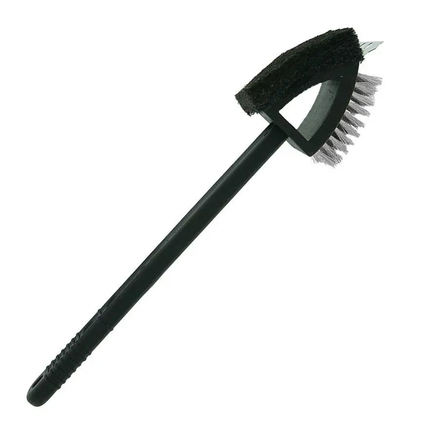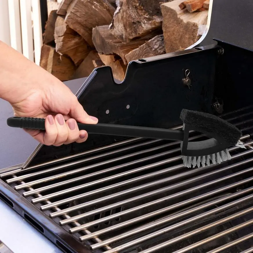 Keep your hand at a safe distance from the heat and get maximum leverage for scraping down that grate with this oversized grill brush. The brush features a long, easy-grip handle and a dual-head with steel bristles on one side and an abrasive scrubber on the other.