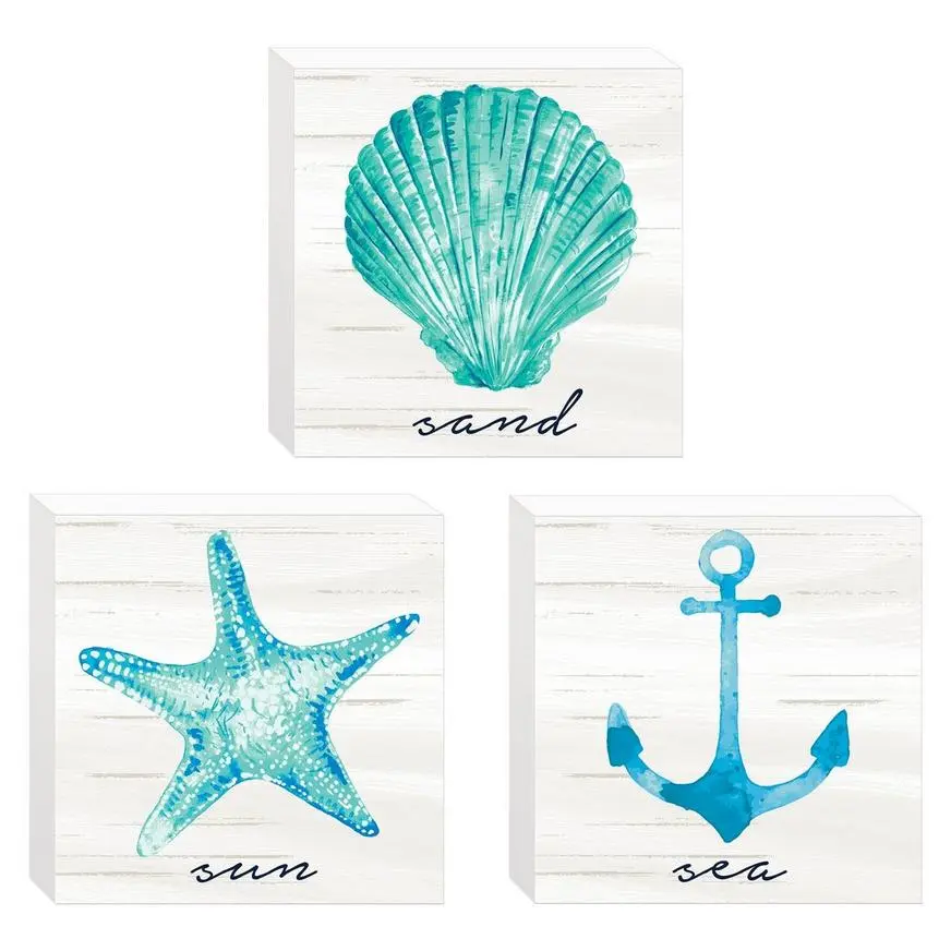Refresh your space for warmer weather with nautical-themed block signs. Each fiberboard sign comes in a wash of white paint with either an anchor, shell, or starfish design in blue. Headlines featured are “Sea,” “Sand,” and “Sun,” perfect for setting the tone for the season ahead.