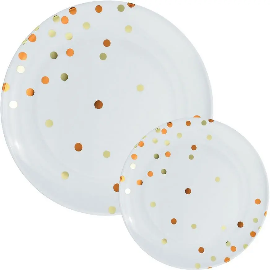Set a fun and festive table for your guests with Confetti Plates! This set includes two sizes of premium plastic plates that feature orange and gold metallic confetti dots on a white base and a raised raised inner lip. Create lively table settings for holidays and special occasions with these whimsical plates.