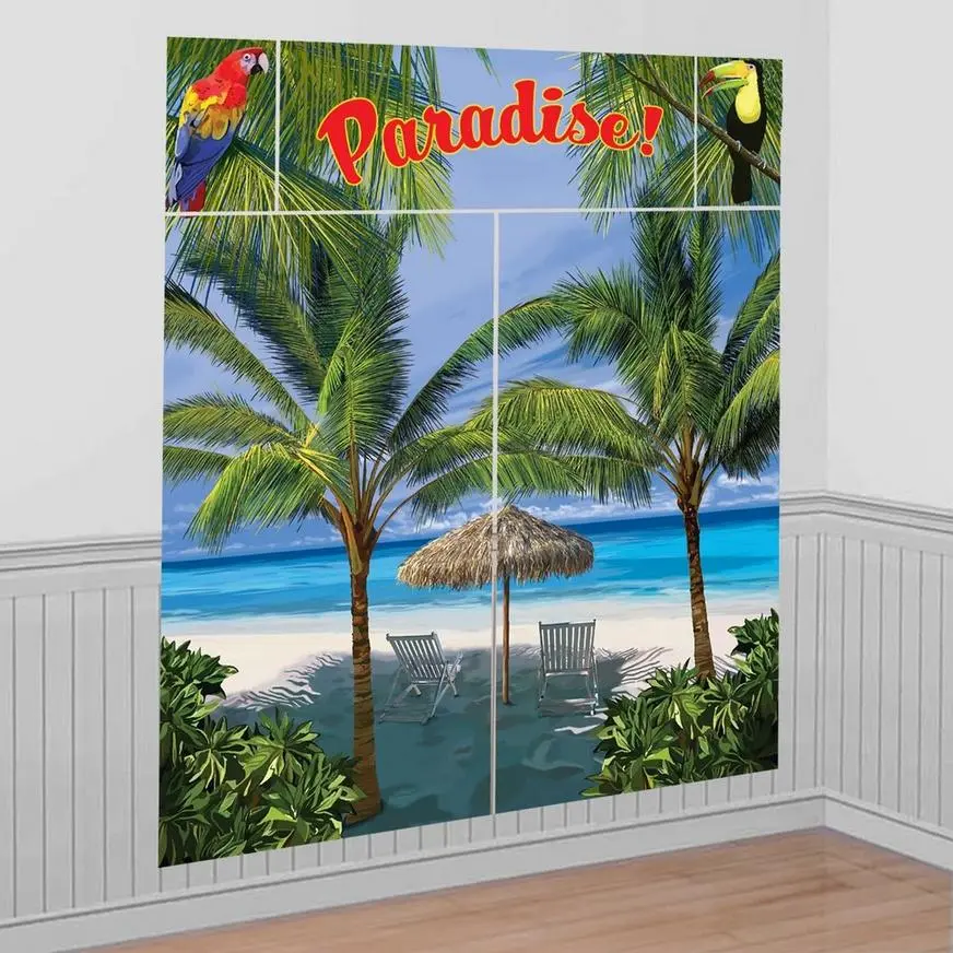 Transform any room into a tropical oasis! This Paradise Palm Tree Scene Setter is a giant five-piece set of posters that combines to make a beach scene that covers the whole wall. These posters feature a serene beach setting with lounge chairs, a straw umbrella, palm trees, and calm blue ocean waters. The top banner has a colorful parrot and toucan with red “Paradise!” headline. Use this lightweight vinyl Paradise Palm Tree Scene Setter as a background for taking pictures at your summer party! Suitable for indoor and outdoor use.