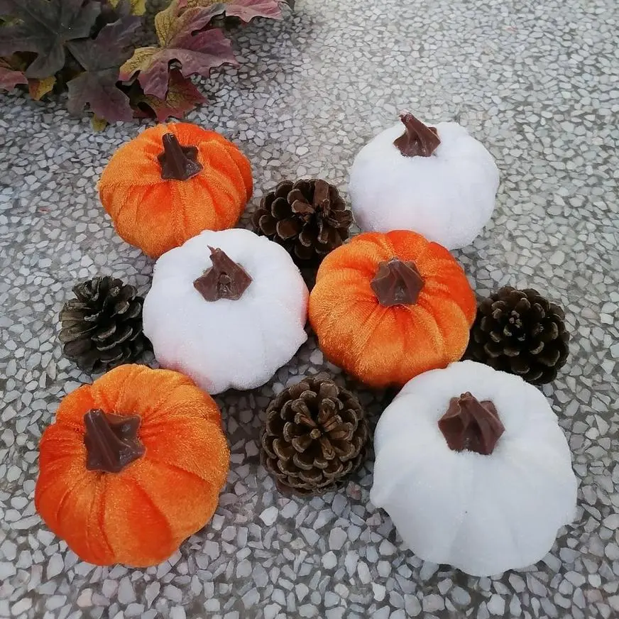 Gourdness, gracious, this table decoration is gorgeous! This festive fall set contains six pumpkins with brown stems and four pinecones—perfect for setting on your Thanksgiving table, mantel, or any shelf.