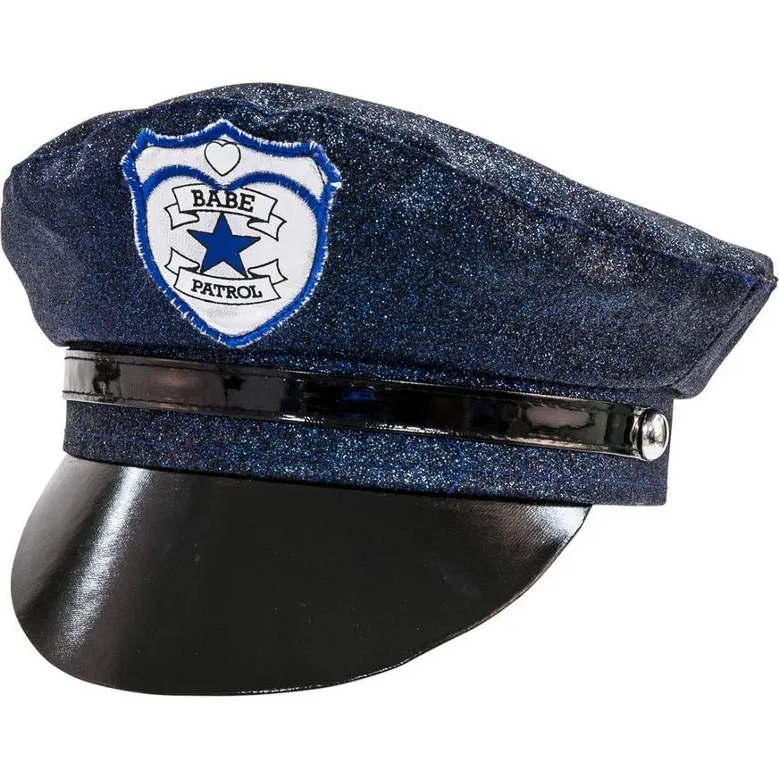 Strike the pose of a law enforcement hottie! This Sexy Police Hat is made of shimmering blue fabric with a silver “Babe Patrol” badge on the front. The black visor in the front enforces your authority, while a snap closure in the back makes it easy to pull on and off. A fun way to protect and serve!