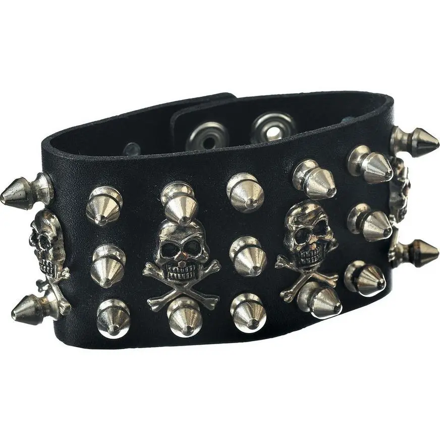 Add attitude to your punk look with this Skull Stud Bracelet! This skull bracelet features a thick black faux leather bracelet decorated with metal skulls and spikes. A Skull Stud Bracelet is perfect for completing your costume! The bracelet has an adjustable strap to fit most wrists.