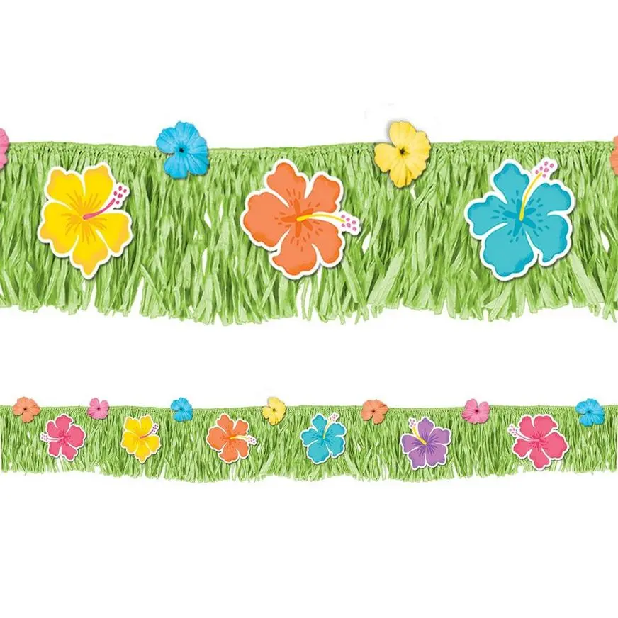 Bring tropical vibes to your summer get-together with Summer Hibiscus Deck Fringe! This fringe banner features fabric and cardstock hibiscus flowers decorating the plastic grass skirt fringe. Easy to hang, this fringe transforms your deck, table, or banister into a lush island get away.
