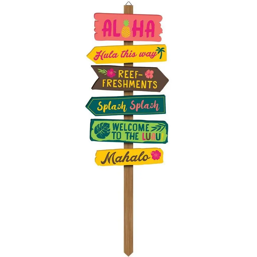 Direct your guests to the luau with this Hawaii-inspired yard sign. It features directional signs with fun headlines like “Reef-freshments” and “Welcome To The Luau.”