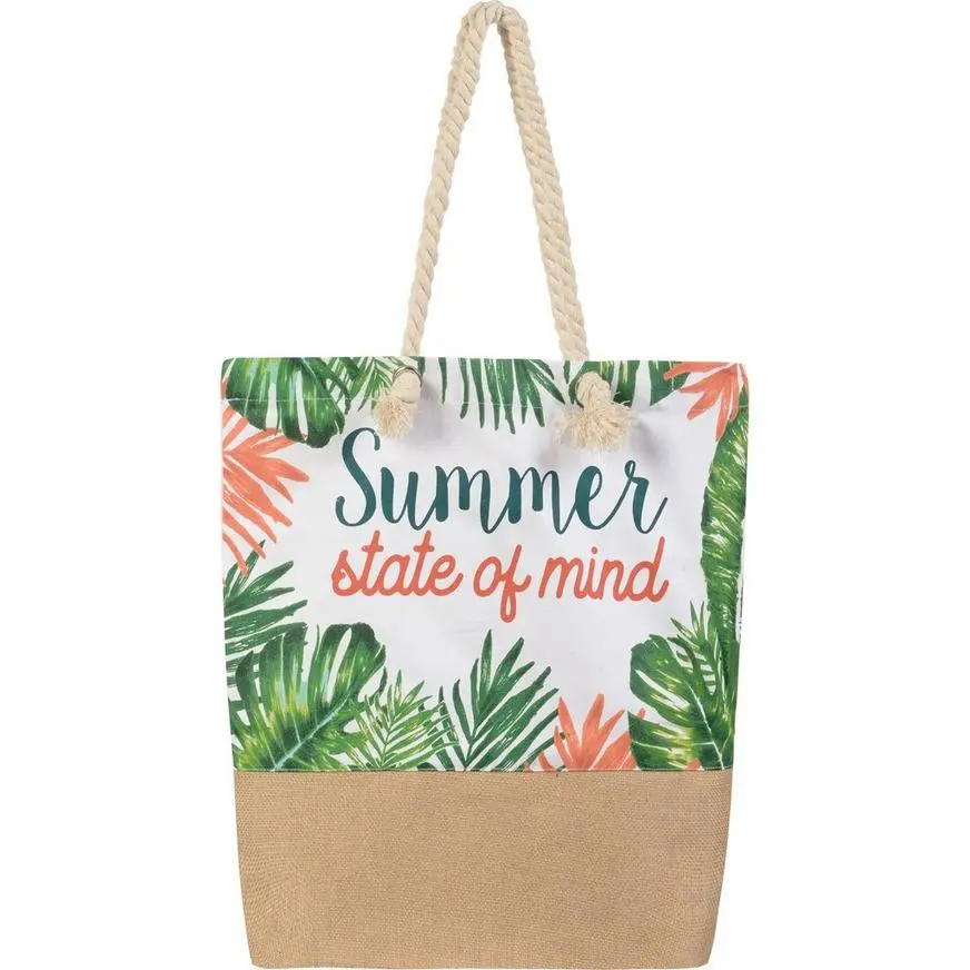 Prepare for a day outdoors by packing all your essentials in this handy tote bag. The white and burlap tote bag features a leafy pattern that surrounds to a “”Summer State Of Mind”” headline. The bag also has attached rope handles for easy transport.