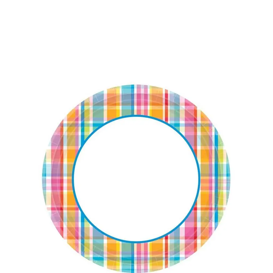 Go preppy for your party with Sunny Plaid Dessert Plates! These small round paper plates have a border of pink, blue, and yellow plaid to go with your spring or summer party theme. Serve a slice of cake or a handful of snacks on colorful dessert plates. When your summer party is over, simply toss the disposable paper plates for quick and easy cleanup.