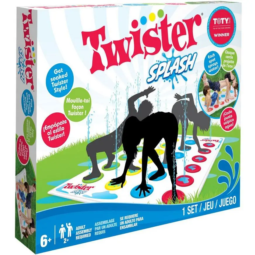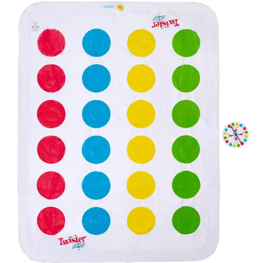 Take the Twister fun outside with this clever water game! The classic Twister mat hooks up easily to your garden hose and fills with water in just a minute. Spin the waterproof pad, place hands and feet on the spots, and see who falls, all while the dots splash the players.