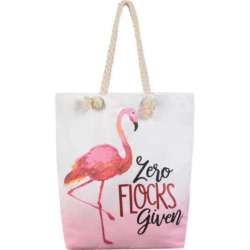 Prepare for a day outdoors by packing all your essentials in this handy tote bag. The white and pink canvas tote bag features a flamingo illustration next to a “No Flocks Given””headline. The bag also has attached rope handles for easy transport.